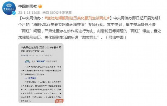 中央网信办即日起开展为期1个月的“清朗·2023年春节网络环境整治”专项行动。其中提到,集中整治各类不良“网红”问题,严肃处置存在炒作劣迹行为史、刻意扮丑等问题的“网红”博主,查处炫耀服刑经历、美化服刑生活的所谓“励志网红”。