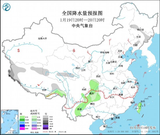1月19日20时至20日20时,黑龙江南部、吉林东部、西藏西部和东南部、青海南部、陕西南部、重庆东南部、贵州北部等地的部分地区有小雪或雨夹雪,其中西藏西部有中到大雪,局地暴雪(10~13毫米);四川盆地东部、贵州东部和西部、云南东部、台湾岛等地的部分地区有小到中雨。内蒙古中西部、河北北部和东部、北京、天津、辽宁等地的部分地区有4~6级风。渤海、渤海海峡、黄海大部海域、东海北部海域将有6~7级风、阵风8级;东海南部海域、台湾海峡、台湾以东洋面、巴士海峡、南海大部海域将有6~8级风、阵风9~10级(见图2)。