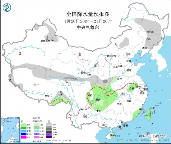 1月18日20时至19日20时,新疆北部、内蒙古东部、东北地区大部、西藏东部和西部、川西高原、贵州西部等地部分地区有小雪或雨夹雪,其中,吉林北部和东部等地部分地区有中雪;西藏东南部、四川盆地、重庆中南部、贵州东北部、云南中东部、海南岛东部、台湾岛大部等地部分地区有小雨。内蒙古西北部、甘肃河西、山西中部、河北北部等地部分地区有4~6级风。渤海、渤海海峡、黄海大部海域、东海北部海域、台湾海峡、南海大部海域、台湾以东洋面、巴士海峡将有6~7级、阵风8级的偏北风(见图1)。
