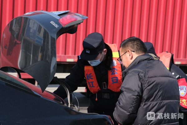 1月17日晚上 ,正在海太汽渡渡轮上的长航公安南通分局海门派出所民警正密切地注视着江面的情况,北风夹杂着冷气刮过江面带起的水浪,在南通一端的渡口,渡轮放下甲板,民警和引导员一道迅速挥动手中旗帜,引导车辆上船。