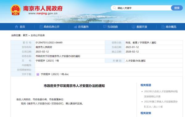 记者今天(1月18日)从南京市住房保障和房产局获悉:南京市政府1月16日正式发布《南京市人才安居办法》,并于2月12日起正式实施,有效期至2028年2月11日。