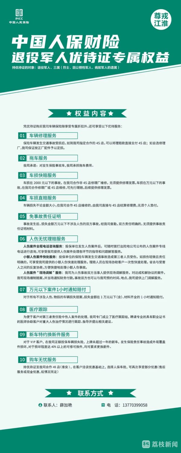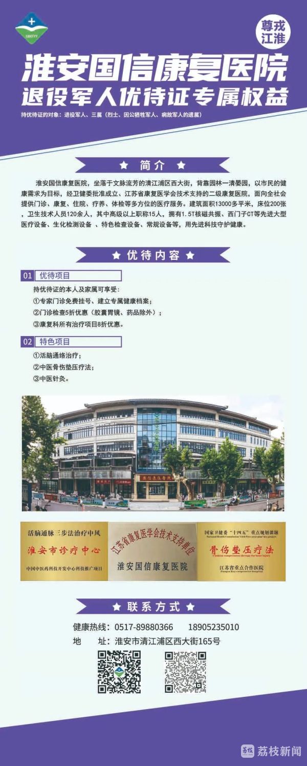 据介绍,淮安市退役军人及其他优抚对象持证可享受就医、保险等方方面面的优待,如至淮安国信康复医院可享专属权益,如专家门诊免费挂号、建立专属健康档案、门诊检查5折优惠等。