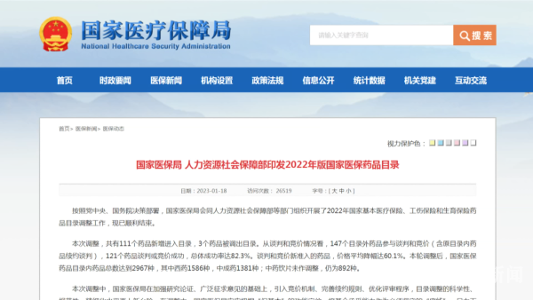 本次调整,共有111个药品新增进入目录,包括慢性病、肿瘤、抗感染、罕见病、新冠感染治疗用药等。同时,调出3种被注销批准文号的药品。谈判和竞价新准入的药品,价格平均降幅达60.1%。本轮调整后,国家医保药品目录内药品总数达到2967种,其中西药1586种,中成药1381种,中药饮片892种。通过谈判降价和医保报销双重减负效应,本次调整预计未来两年将为患者减负超过900亿元。