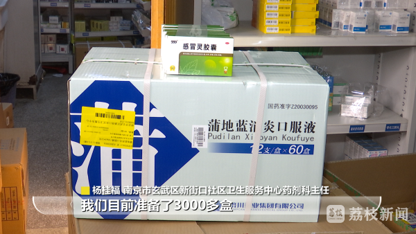 南京市玄武区新街口社区卫生服务中心药剂科主任杨桂福说:“解热镇痛的、抗病毒、然后抗生素,还有咳嗽药品,还有常规的肠胃道的药品,我们准备都非常充分,大概能保证1个月以上的保供。比如说感冒灵胶囊,我们目前准备了3000多盒,包括我们抗病毒的蒲地蓝口服液,蒲地蓝口服液我们准备了1000多盒,也能用到3个月的量。”