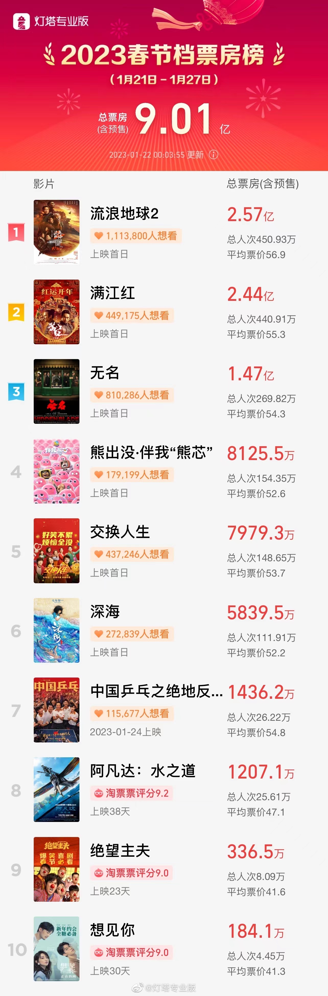 荔枝新闻讯 据灯塔专业版实时数据,截至1月22日0时,2023年春节档实时预售总票房达9.01亿。《流浪地球2》《满江红》《无名》分列前三名,《熊出没》超过《交换人生》位列第四。
