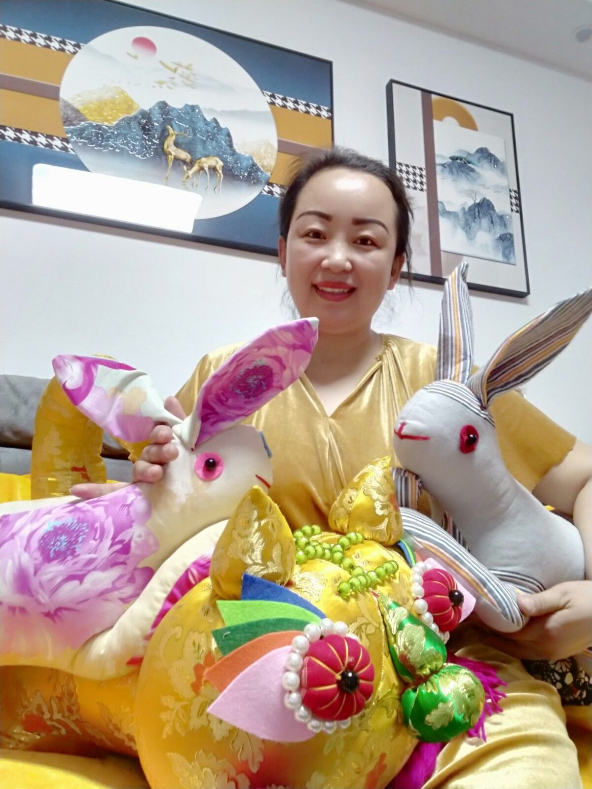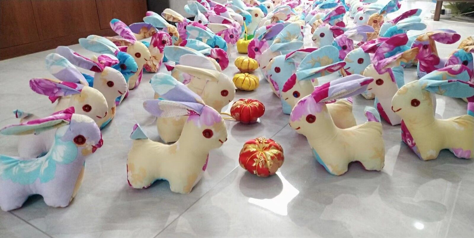 五彩斑斓的棉布,经过王彩红一针一线的缝制后,一只只活灵活现的布艺兔子就呈现在眼前......