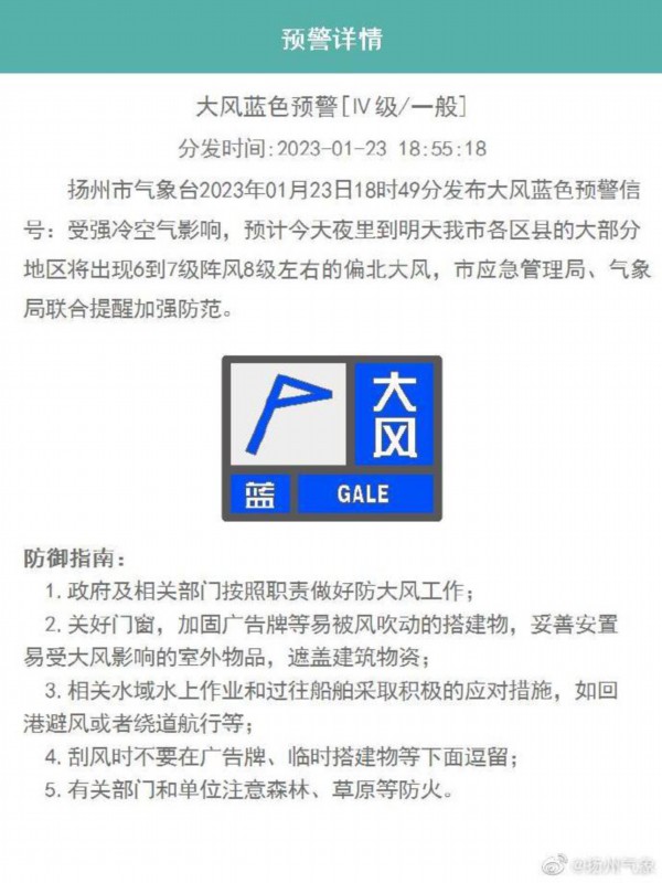 扬州市气象台发布大风蓝色预警信号