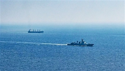 图为中国海军护航编队舰艇正在亚丁湾水域执行护航任务。