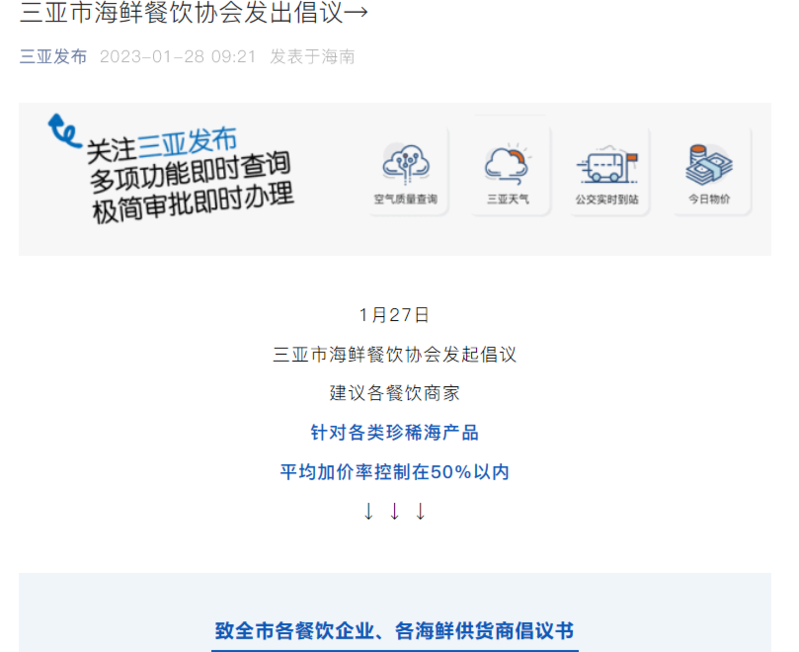 荔枝新闻讯 据“三亚发布”微信公众号消息,三亚市海鲜餐饮协会发起倡议,建议各餐饮商家针对各类珍稀海产品,平均加价率控制在50%以内,致全市各餐饮企业、各海鲜供货商倡议书。 详情如下: