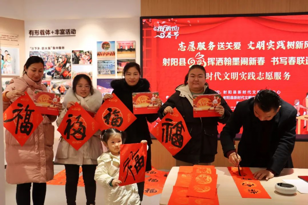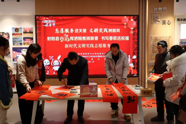 春节期间,射阳县新时代文明实践中心、射阳县新时代文明实践志愿服务总队、射阳县文联联合组织开展“挥洒翰墨闹新春 书写春联送祝福”新时代文明实践志愿服务活动,县文艺志愿者为市民送春联、送“福”,为春节增添浓郁的节日氛围。