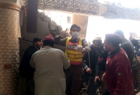 1月30日,在巴基斯坦西北部开伯尔-普什图省首府白沙瓦市,人们在爆炸袭击事件现场搜救(手机拍摄)。新华社发