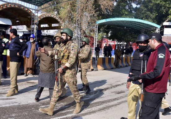 1月30日,在巴基斯坦西北部开伯尔-普什图省首府白沙瓦市,安全人员在爆炸袭击事件现场附近警戒。新华社发(赛义德·艾哈迈德摄)
