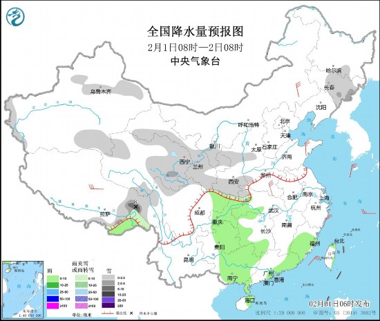 2月1日08时至2日08时,新疆沿天山地区和南疆盆地、西藏东部、吉林中东部、西北地区中东部等地部分地区有小到中雪或雨夹雪,局地大雪。西南地区东部、湖北南部、湖南西北部和南部、广西大部、广东东南部、福建中部和南部、海南岛东北部等地部分地区有小雨。内蒙古东部、西藏、青海、山东、河南等地部分地区有4~6级风。渤海、黄海、东海北部海域、台湾海峡、巴士海峡、南海东北部海域将有6~7级风、阵风8~9级(见图1)。