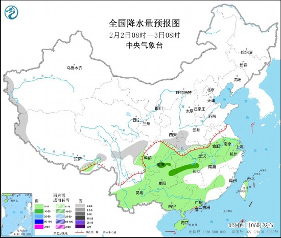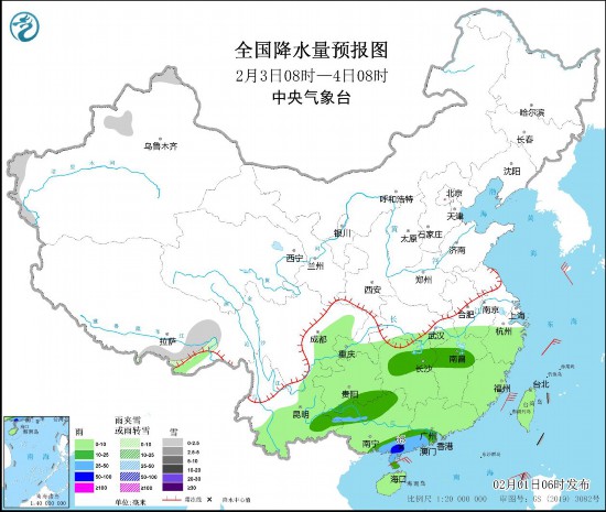 2月2日08时至3日08时,新疆南疆西部山区、西藏东部和西部、陕西南部、河南西部、湖北西北部、川西高原北部等地部分地区有小雪或雨夹雪。江淮西部和南部、江汉、江南北部和西部、西南地区东部和南部、华南大部等地部分地区有小到中雨。黄海、东海北部海域、南海海域将有6~7级风、阵风8~9级(见图2)。