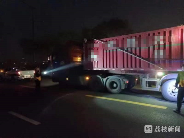 昨天(1月31日),南京江北新区综合行政执法总队夜间巡查至玉带路时,发现一辆重型半挂牵引车正缓缓驶来,执法人员立即拦停该车辆。