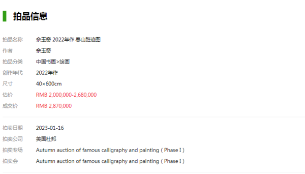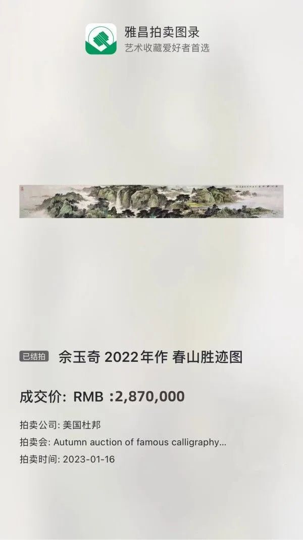2023年1月16日,在美国杜邦拍卖有限公司举行的中国书画大型拍卖会专场上,此前备受关注的画家佘玉奇作品《春山胜迹图》经多轮激烈竞逐,最后以287万落槌成交。