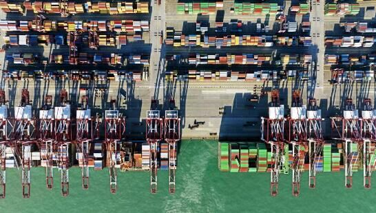 1月27日,集装箱货轮在青岛港前湾集装箱码头装卸货物(无人机照片)。新华社记者 李紫恒 摄