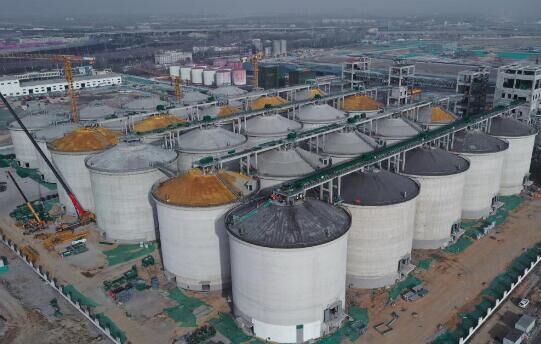 1月8日,工人在中央储备粮秦皇岛直属库有限公司海港粮食储备基地项目建设工地施工(无人机照片)。新华社记者 杨世尧 摄