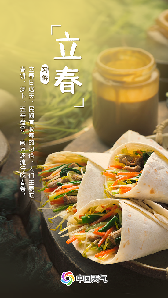 吃春饼“咬春”的习俗在北方流传广泛,人们将面烙或蒸制成薄饼,再将豆芽、菠菜、韭黄、粉线等炒成合菜,用饼卷着合菜吃。南方立春吃春卷,春卷馅料十分丰富,有豆沙、花生、白菜肉馅及海鲜等,是用干面皮包上馅料,经煎、炸而成。吃春饼和春卷,都是为了迎接春天的到来。