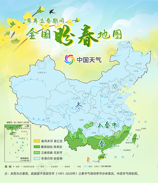 从中国天气网推出的立春期间全国盼春地图来看,常年进入立春时,我国仅有云南、广东、广西、海南、台湾以及福建部分地区处于气象意义上的春季,真正享受暖意融融的春日。立春节气期间,春天的脚步继续北上,重庆西部、福建中北部以及云南东北等地会都会开启入春进程。而全国其他绝大部分地区,此时仍处在“寒意未退盼春来”的季节中。