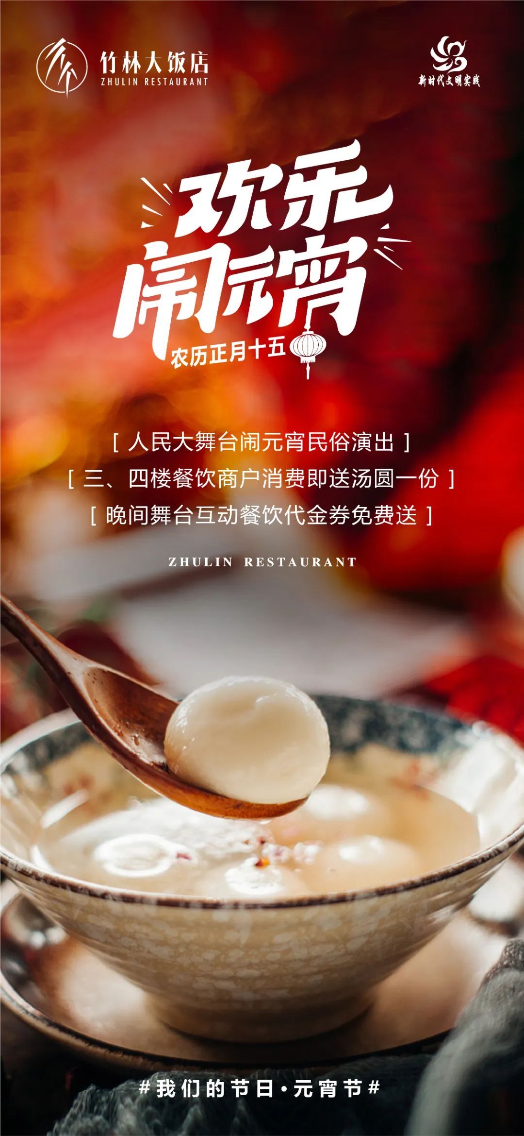 元宵佳节,竹林大饭店为大家献上了丰富的文化大餐和地道美食。一系列的民俗表演,搭配猜灯谜、吃元宵等趣味互动,欢腾不停,乐趣不断。