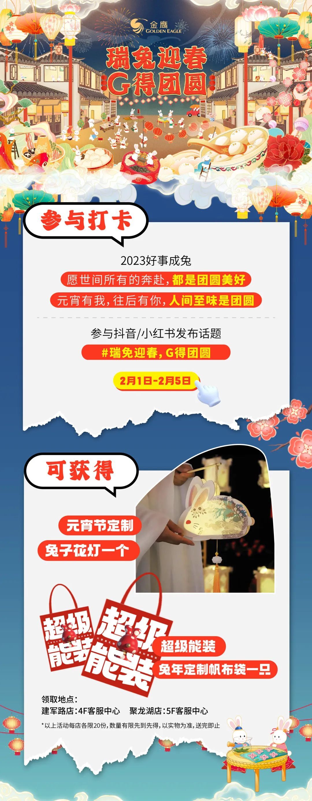 参与小红书/抖音话题打卡#瑞兔迎春,G得团圆,即可领取定制兔子花灯一只或兔年定制帆布袋一只。