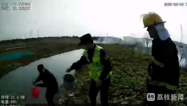 接警后,值班民警陆安带上灭火器第一时间赶往现场。抵达事发现场后,只见消防车停在路边,乡村道路通行不便,消防员只能提着消防水带赶往起火点。此时,火势已蔓延,浓烟滚滚,起火点靠近村庄和农田,如不及时扑灭势必会威胁周边居民的生命财产安全。