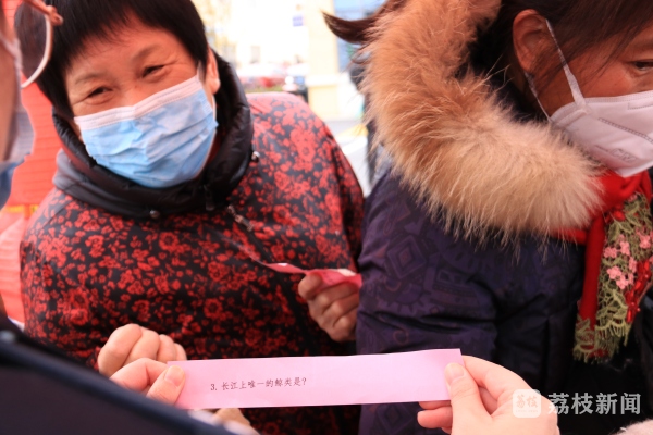 “立冬——打一党史名词”“秋收起义!”2月4日上午,在长航南通公安港口派出所、南通市如东县黄海村村委会联合举办的“猜灯谜忆党史 警民共庆元宵”主题庆祝活动现场,人头攒动,大家在一条条灯谜面前,或驻足思索,或激烈讨论,不一会儿,一道道灯谜被解答出来,人们在奖品兑换点前排起了长龙,每个人脸上都写满了快乐。