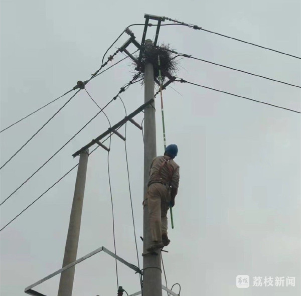 2月4日,国网徐州邳州供电公司综合能源服务队员线路运维人员,在巡线过程中对10千伏八镇线藤家支线20号杆鸟巢进行登杆摘取,及时降低因鸟类筑巢引发的电力安全隐患,全力保障线路安全可靠供电。