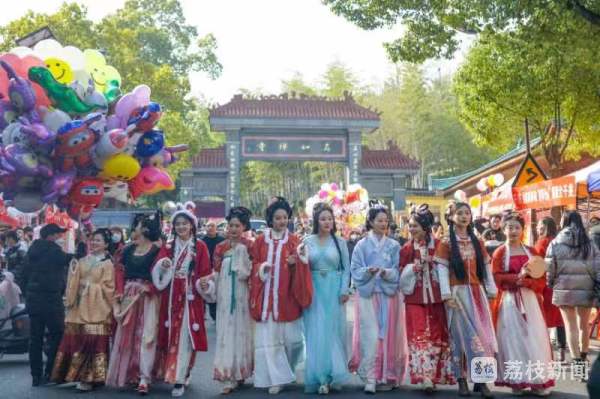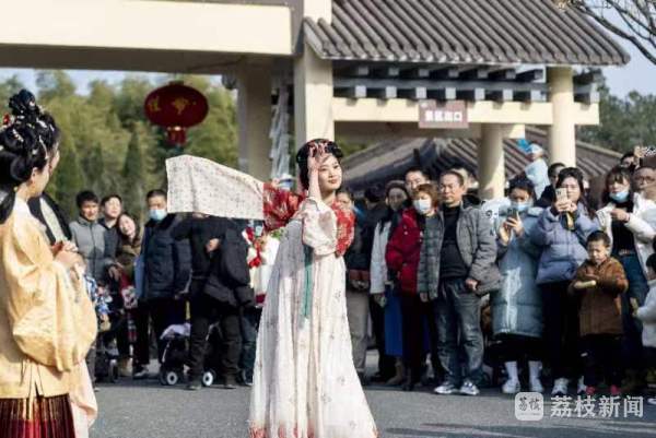 “加油!加油!”旁边的游戏体验区,游客们发出阵阵喝彩。原来,为增添趣味性,景区在山顶设置了投壶、射箭互动游戏,游客许愿结束可前往体验,为自己投进一只“财源滚滚”“身体健康”“万事顺遂”,射中一只“学业进步”“平平安安”“万事大吉”。“运气真好,中奖啦!”游子山上2023好运多多新年福袋活动区,景区将一份份惊喜、一个个祝福放入兔年福袋供游客抽取,为游客带去新春好礼。最热闹地方当然还是游子山仿古街区的市集,穿梭仿古街道购手作小物、尝地道小吃,感受最地道的人间烟火味,乐趣无限。为了让游客沉浸式体验民俗风情,过好“我们的节日”,游子山还为游客准备了一场穿越时空的汉服走秀活动,身着汉服的丽人们列队而来,往返于仿古街、祈福园之间,为游客带去一场华丽汉服结合中式礼仪的视觉盛宴。现场更让游客欣喜的是,今年高淳首次策划举办的“晒霉”快闪视频活动,歌手演员们随机出现在游子山、高淳老街两大景区,为游客送上歌舞及民俗表演,与游客共庆佳节。