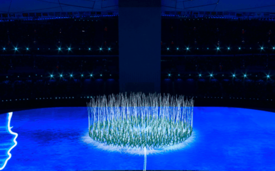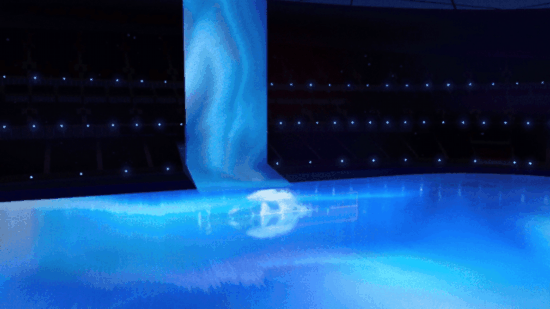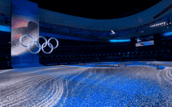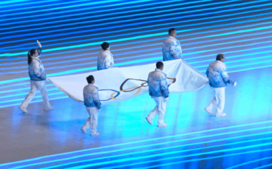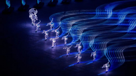 延续平昌冬奥会闭幕式上北京八分钟的“人机共舞”创意理念进行了多次技术迭代,最终在北京冬奥会开幕式上,结合以往大型演出活动中很少出现的实时人机交互系统,完美呈现出“致敬人民”与“一鸽都不能少”的人与影像实时互动效果。
