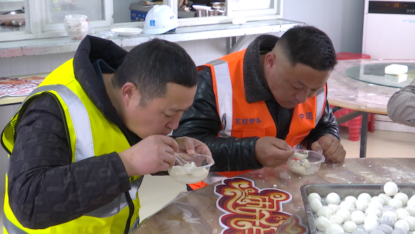 木工唐荣贴,安徽人,前几年都是在老家过完了元宵节才回到项目上。今年工期紧,他早早就返回了南京。他告诉记者,没想到在工地过元宵节也能这么热闹。唐荣贴说:“这是我第一次在工地上过元宵节,有吃有玩也有氛围。以前在家里是和家里人一起包汤圆,今年在工地上和工友一起包,人也挺多的,感觉也挺热闹的,项目部搞的这些活动,让我们心里也感觉到了很温暖。”