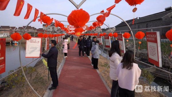 在俞垛镇,当地的学习新思想主题公园内装扮一新,火红的灯笼挂满长廊。灯笼下,一个个谜面令人跃跃欲试,特别是这些谜面都与党史及党的二十大有关。