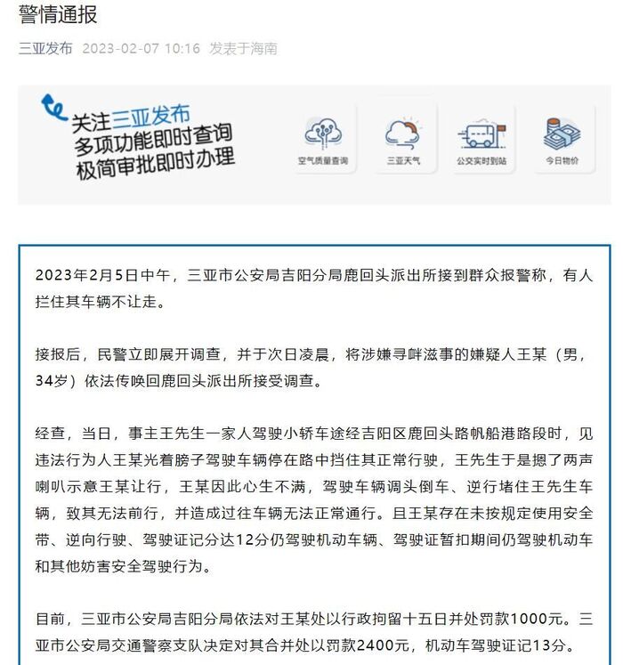 荔枝新闻讯 据“三亚发布”微信号消息,2023年2月5日中午,三亚市公安局吉阳分局鹿回头派出所接到群众报警称,有人拦住其车辆不让走。