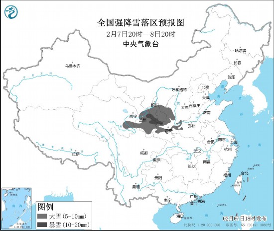 7日夜间至9日,中东部地区将出现大范围雨雪天气过程,江汉、江淮、江南、华南北部等地有中到大雨,部分地区暴雨;西藏东部、西北地区、华北西部和北部、黄淮西部等地有小到中雪或雨夹雪,部分地区有大雪,局地暴雪。预计2月7日20时至2月8日20时,青海东南部、甘肃中东部、宁夏中南部、陕西大部、河南西部等地的部分地区有大雪,其中,甘肃东部、宁夏南部、陕北高原和秦岭山区等地的部分地区有暴雪。上述部分地区新增积雪深度4~8厘米,局地可达10厘米以上。中央气象台2月7日18时发布暴雪蓝色预警(见图1)。
