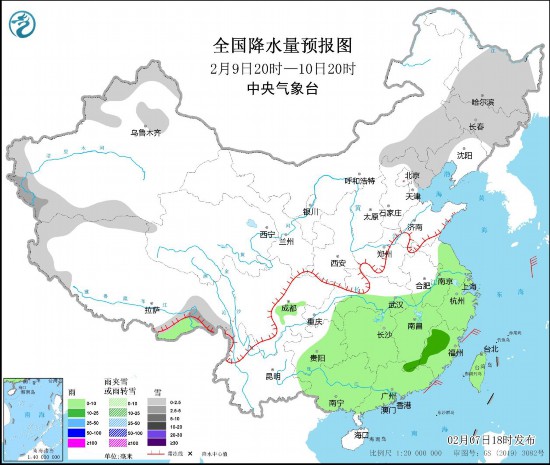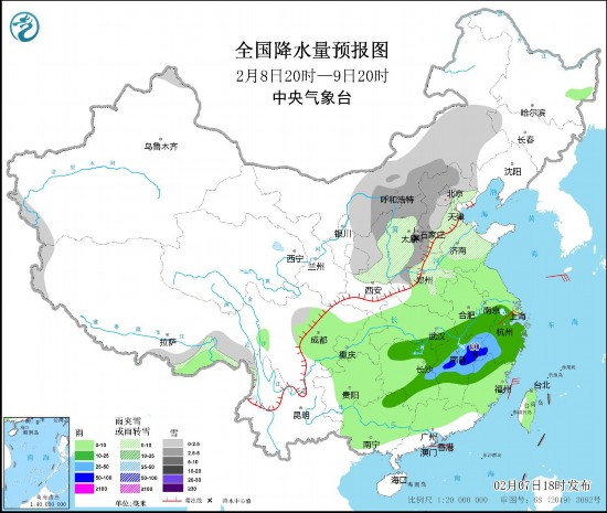 2月8日20时至9日20时,华北、黄淮、西藏东南部、川西高原等地部分地区有小到中雪或雨夹雪,局地大雪。江淮南部、江南中北部等地部分地区有中到大雨,其中,江西中部、浙江西部等地局地有暴雨(50~65毫米)(见图3)。