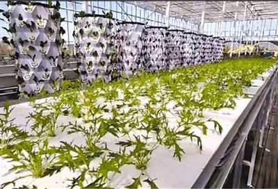 在试验区大棚里参观体验的初中生李星安看到了一番奇妙光景:大棚中蔬菜生产槽整齐排布,槽中的水暗暗流动,水上漂浮着一片片带孔的泡沫板,孔中栽植着生菜、京水菜、紫包菜、冰菜等多种蔬菜。另外一边的蓝色养殖桶上,成簇的水花翻腾,密密麻麻的鱼儿在水中游弋。