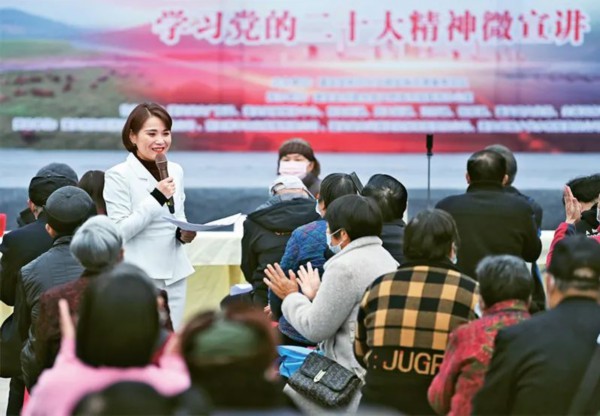 连日来,四川省南充市蓬安县新时代文明实践中心联动县级相关部门组建15支微宣讲分队,深入社区楼院、居民小区,通过“我说你问”、“你问我答”的互动方式把党的二十大精神送到基层。图为2022年11月24日,宣传志愿服务队的队员在蓬安县相如街道相如山社区文化广场向群众宣讲党的二十大精神。人民图片 刘永红/摄