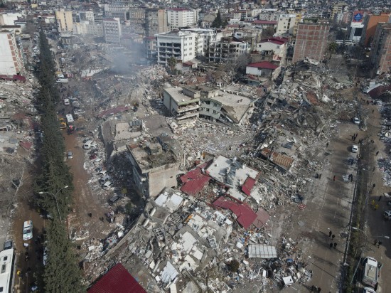这是2月7日在土耳其南部卡赫拉曼马拉什市市中心拍摄的震后景象(无人机照片)。新华社发(穆斯塔法·卡亚摄)