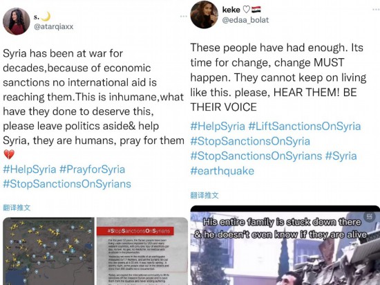 近日,一个名为“Stop Sanctions On Syria”(停止制裁叙利亚)的话题在社交媒体上被大量转发,叙利亚民众和救援机构呼吁西方国家尽快解除对叙制裁,为国际救援提供便利。