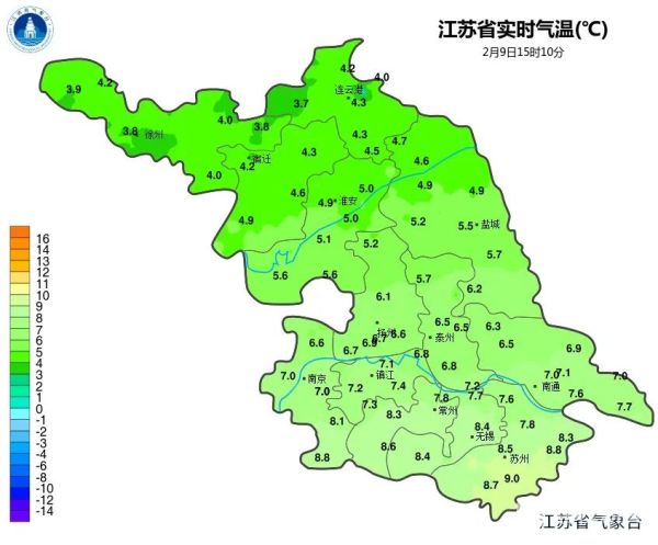 2月9日20时至2月10日20时,淮北地区阴到多云,苏南南部地区阴有小雨,其他地区阴有小雨并渐止转阴到多云。最高温度:东部沿海地区7℃左右,其他地区9~10℃;最低温度:沿淮和淮北地区0~1℃,苏南地区5~6℃,其他地区3℃左右。全省东北风4级左右。