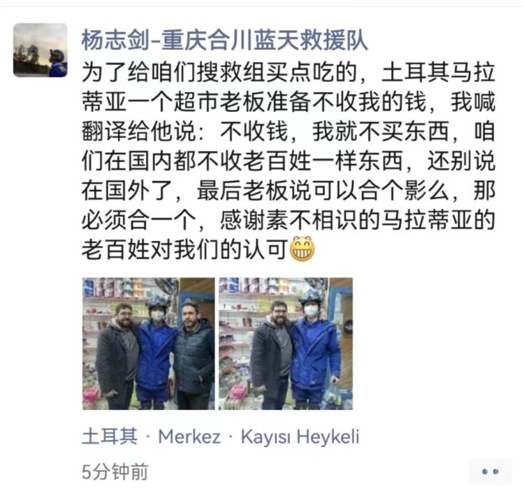 2月9日,土耳其(当地时间),重庆合川蓝天救援队队员杨志建在朋友圈发出一天暖心图文。
