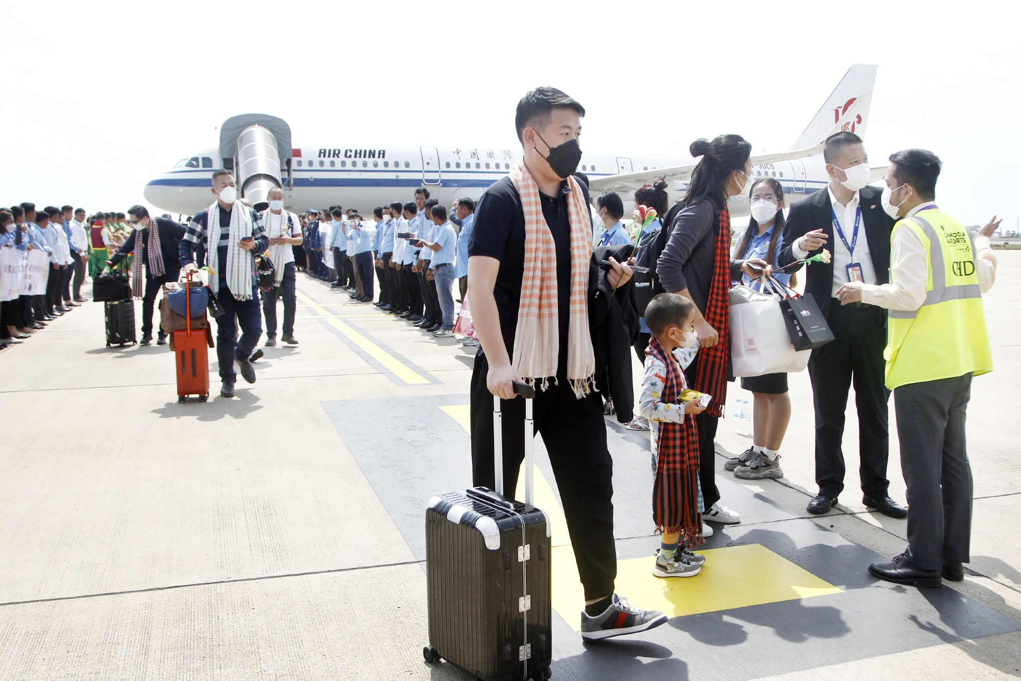 2月7日,一架载有中国乘客的国航航班从北京出发抵达柬埔寨首都金边国际机场,受到柬方热烈欢迎。