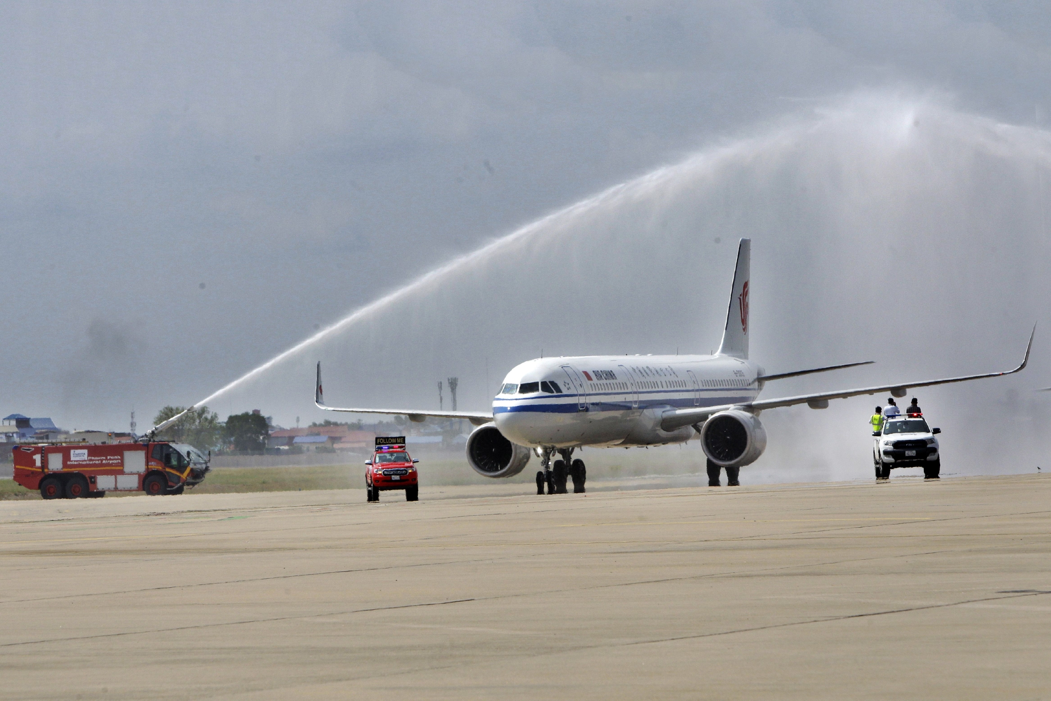 2月7日中午,一架载有125名乘客的中国国航航班在柬埔寨首都金边国际机场降落,受到隆重的“水门礼”接待。伴随热情的柬埔寨传统昌扬舞,柬埔寨旅游大臣童昆和中国驻柬埔寨大使王文天向中国游客逐一送上柬埔寨传统水布和花环。