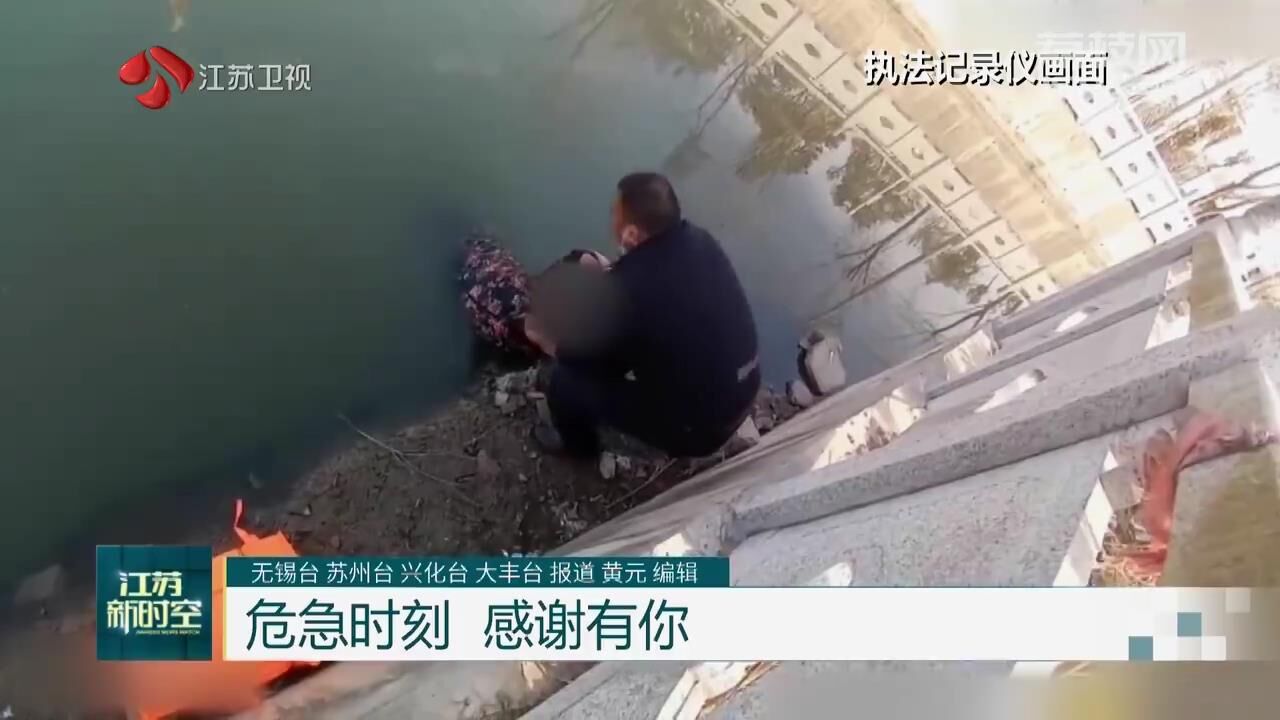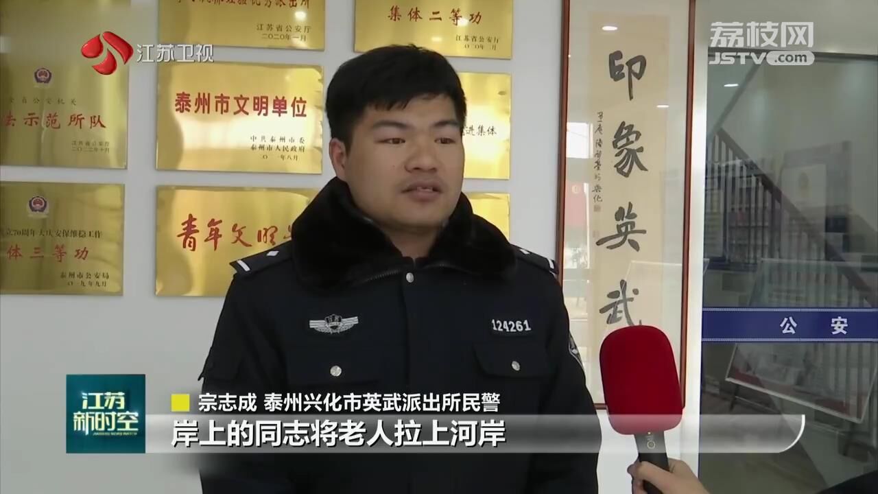 泰州兴化市英武派出所民警宗志成说:“我就立马跳下河将老人救出,用肩膀将老人顶上,岸上的同志将老人拉上河岸,使老人脱离了危险。”