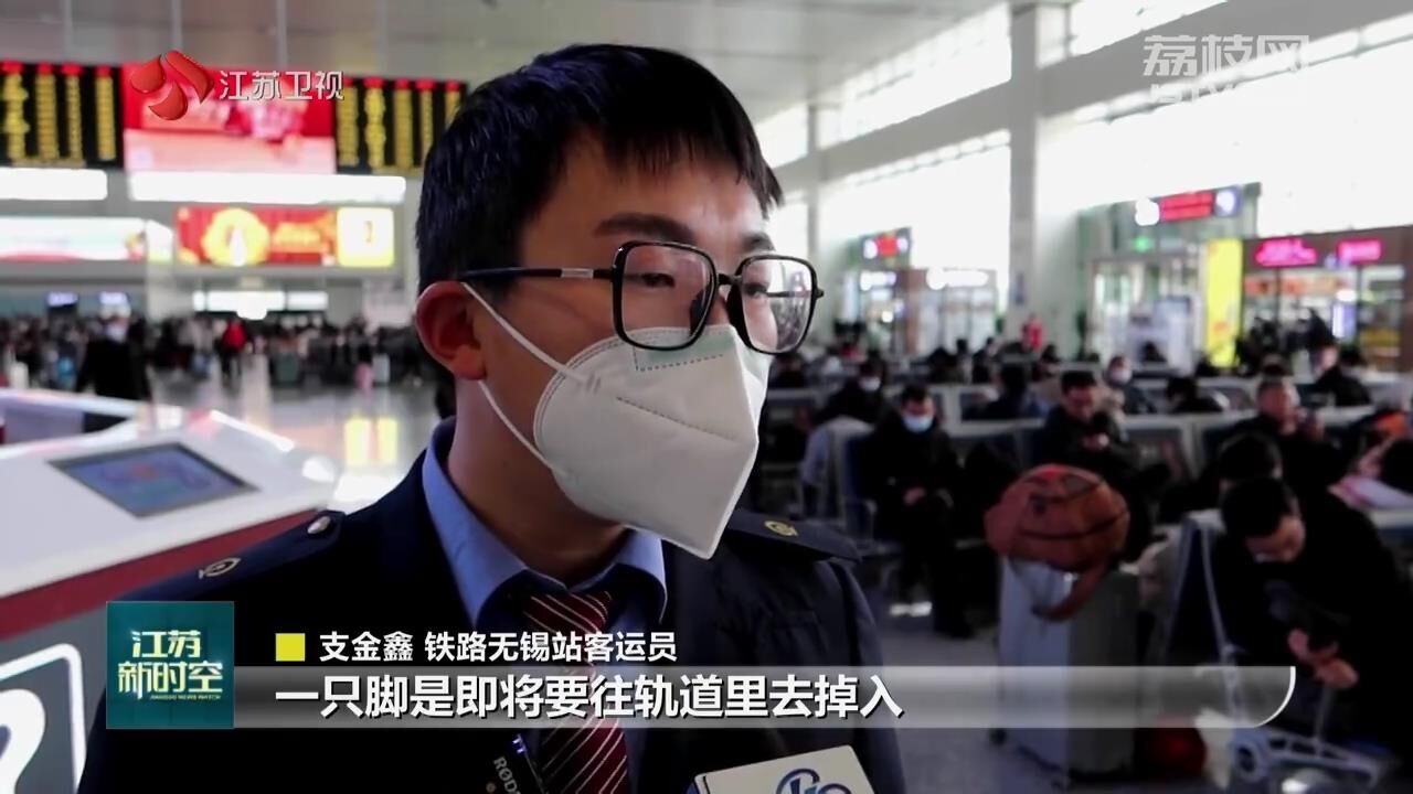 铁路无锡站客运员支金鑫说:“他的身体已经发生倾斜,一只脚是即将要往轨道里去掉入,要踏空了,不拉住他就要掉下去。”