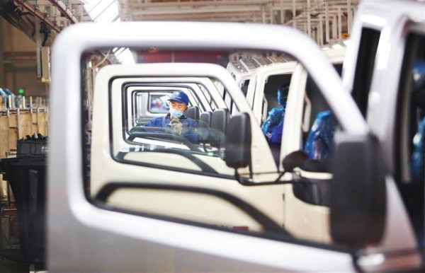 2月10日,山东潍坊福田汽车诸城厂区总装车间,员工在生产意大利微卡汽车订单。春节过后,诸城市优化跨境贸易营商环境,拓市场、赶订单,争取实现外贸出口首季开门红。孙树宝摄(中经视觉)