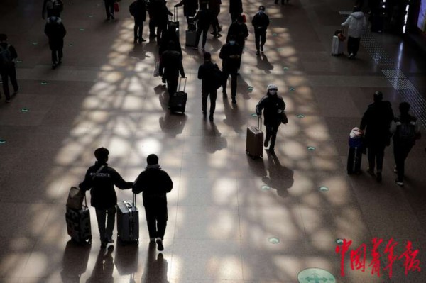 2月10日,北京西站,旅客在长廊中穿梭,准备进入各自的候车大厅。来自国务院联防联控机制春运工作专班数据显示,2月9日(春运第34天,农历正月十九)全国铁路、公路、水路、民航共发送旅客3942.1万人次,环比下降4.0%,比2019年同期下降49.1%,比2022年同期增长21.3%。中青报·中青网记者 陈剑/摄