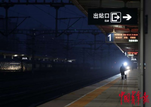 2月10日,河北徐水站,工作人员在站台上接车。中青报·中青网记者 陈剑/摄