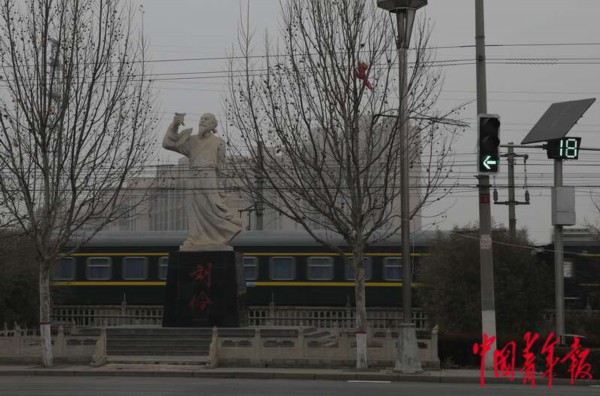 2月10日,河北徐水,一列火车经过一处雕像附近。中青报·中青网记者 陈剑/摄